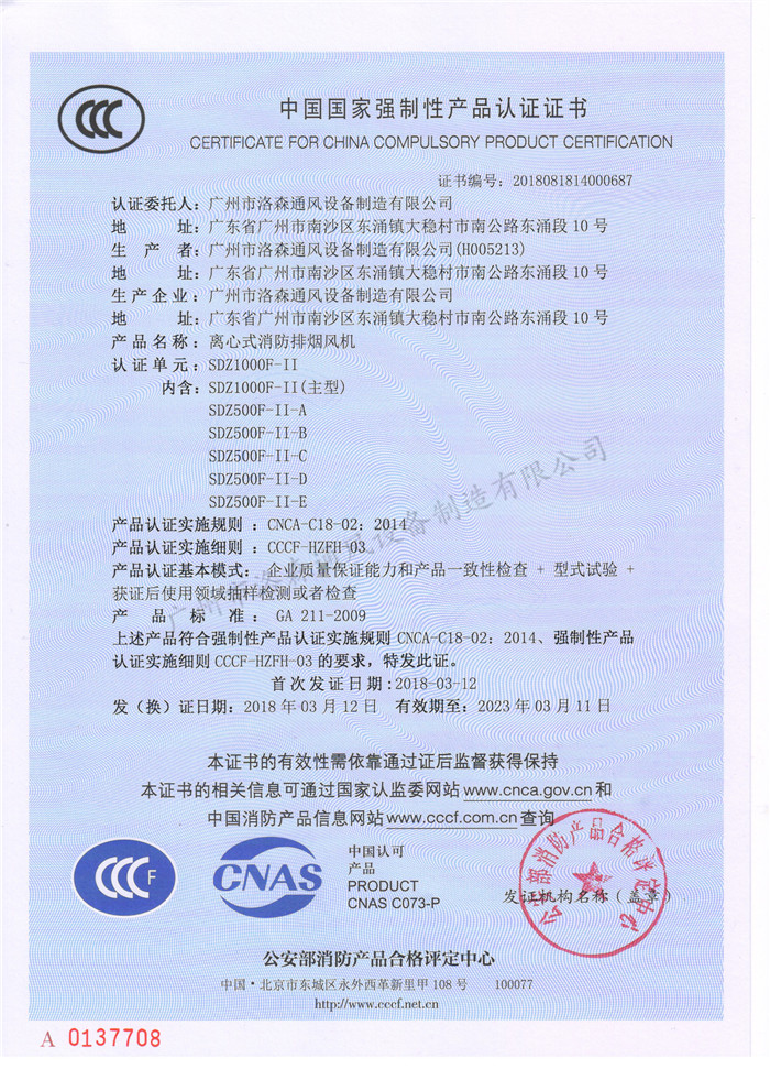 • CCCF證書-洛森風(fēng)機180314離心式消防排煙風(fēng)機SDZ1000F-II(SDZ1000F-II~SDZ500F-II-E)