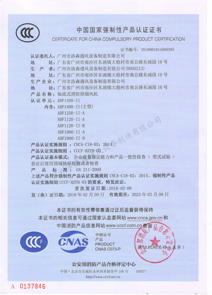 • CCCF證書-洛森風(fēng)機180314軸流式消防排煙風(fēng)機ADF900-II(ADF900-II~ADF400-II-E)